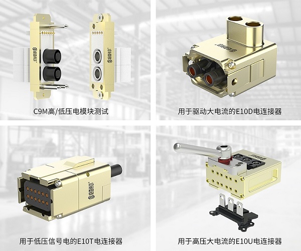 E10电连接器: 专为高频次插拔设计,具有超长使用寿命,能适配多种电气端口,包括信号端口、各类圆形插针/插孔端口、片状端口、夹片端口、VUW铜排端口、铜鼻子及接线柱等。