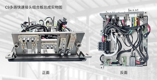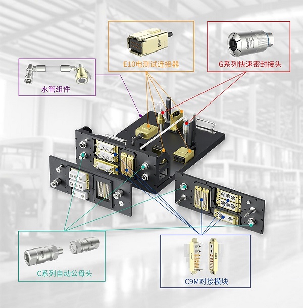 将专用于电性能测试的C9对接模块与高可靠性的E10系列电接头集成于统一的C9多路快速接头组合板总成中,能够同步满足UVW高压、驱动大电流及低压信号等复杂的测试需求。该集成方案完全契合华为DriveONE多合一电驱动系统对测试效率、精度及可靠性的严格要求。