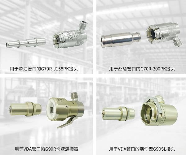 G70R系列: 专为冷却水路、油路、气路等管口的快速密封设计,兼容密封凸缘管口、J2044燃油管口及VDA管口。其L型结构优化空间利用,特别适合狭窄安装环境。